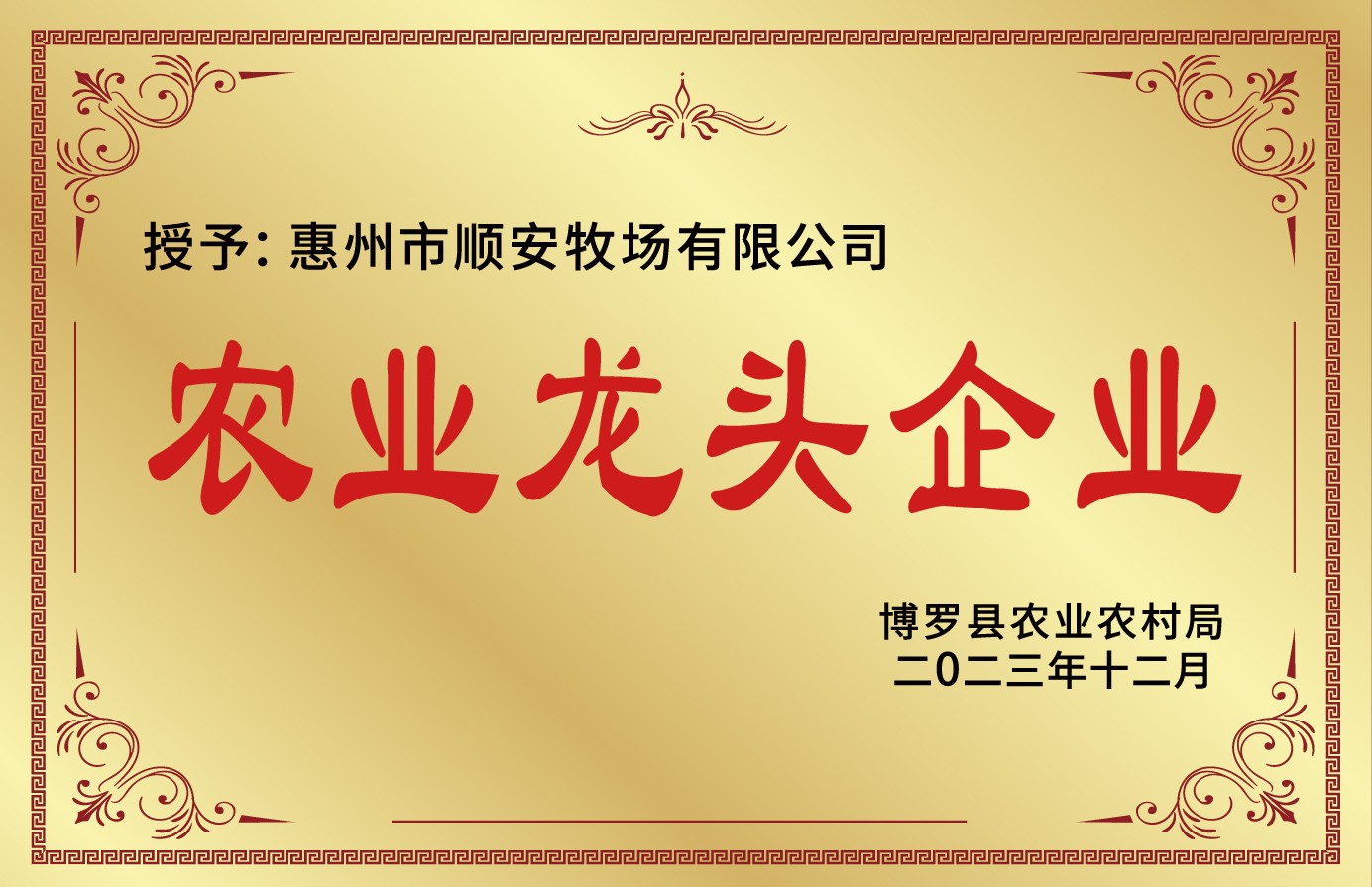 2023年12月,博羅縣農(nóng)業(yè)農(nóng)村局正式公布了一項(xiàng)重要決定,授予惠州市順安牧場有限公司“縣級農(nóng)業(yè)龍頭企業(yè)”榮譽(yù)稱號,以表彰公司在農(nóng)業(yè)產(chǎn)業(yè)化發(fā)展及鄉(xiāng)村振興中所做出的突出貢獻(xiàn)與卓越成績。